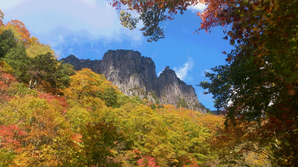 写真1)紅葉真っ盛りの登山道から錫杖岳