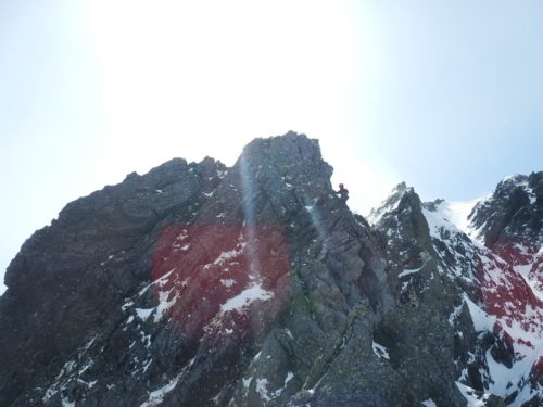 たまに吹きつける突風に耐えながら、リッジを超え、P2の最後のハング越えは5級程のムーブが要求されました。