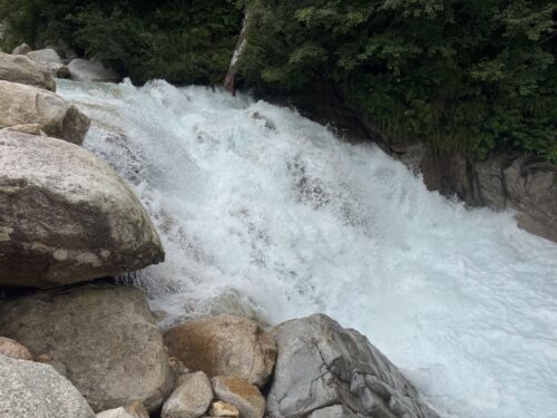 この日も増水の影響は続いており、撤退を考えた。やはり渡渉が難しく高巻きも試みた。前日よりは少し水が引いていたため、ロープを出して何とか行き来できるところを発見。ロープなしでは絶対に流される勢いだった。釣りがメインの目的の山行であったが増水のためポイントが絞れず全然釣れなかった。乃村さんが3匹釣ってくれ、美味しい岩魚をいただいた。釣りがうまくいかず悔しい。