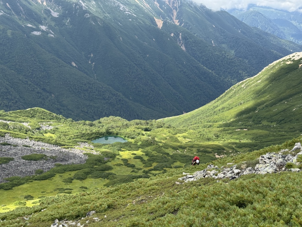 脱渓が近づくにつれ、藪漕ぎとなった。五郎池が見えてきて、そのあたりからゴーロになった。野口五郎よりやや南の稜線に抜けた。そこから、烏帽子小屋のテント場まで進んだ。この日はメンバーそれぞれ2匹ずつ程度釣ることができた。