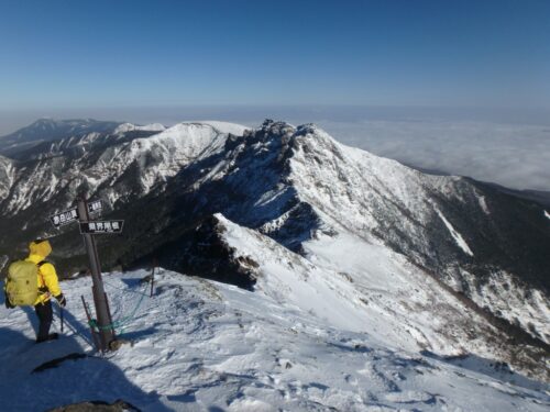 天気良く八ヶ岳全体を見渡すことができたので、赤岳主稜や大同心、小同心などの地形を勉強しながら歩きました。硫黄岳周辺は予想通り暴風でした。